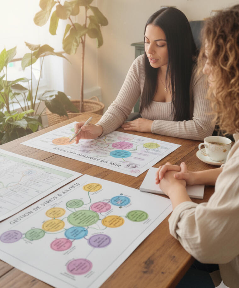 Nous travaillons ensemble en visio, à domicile ou dans un lieu apaisant et je vous offre un suivi pour que vous vous sentiez soutenue et guidée à chaque étape.